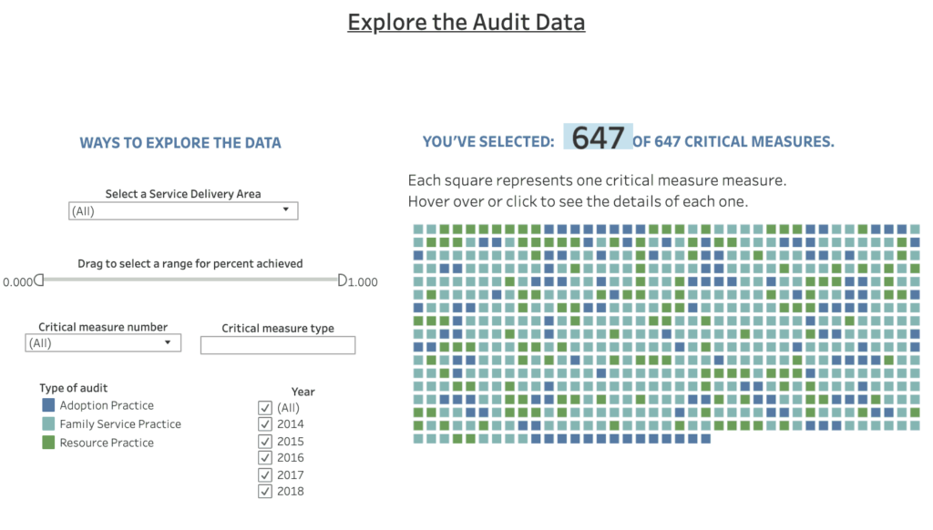 The critical measures are colour-coded to correspond to the type of audit: blue for adoption practice, teal for family service practice, green for resource practice.
