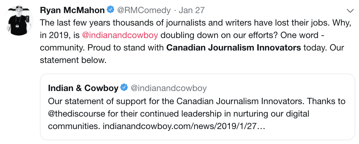 Last week we launched Canadian Journalism Innovators, a new journalist-led initiative to accelerate what is working in Canadian media. Here’s what one of our collaborators, Ryan McMahon, founder of the Independent media organization Indian and Cowboy had to say: