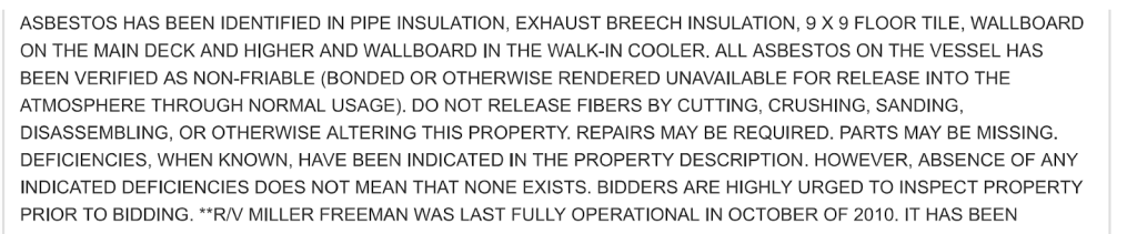 During its auction sale, the U.S. General Services Administration — a United States government auction site that sells items formerly owned by the United States government — confirmed that the Miller Freeman contains asbestos, identified in “pipe insulation, exhaust breech insulation, 9 X 9 floor tile, wallboard on the main deck and higher in the wallboard in the walk-in cooler.”