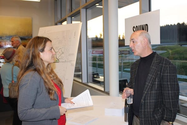 Inside the clubhouse, professional consultants took questions about the proposed expansion of the facility. Community members asked biologist Sarah Bonar about the implications for wildlife habitat — preliminary drawings show new track making seven crossings of fish-bearing streams. The answer, in many cases, was that we don’t know yet. At this stage in the rezoning process, all that’s required is an assessment of what environmental features exist on the property today. That report is available online.