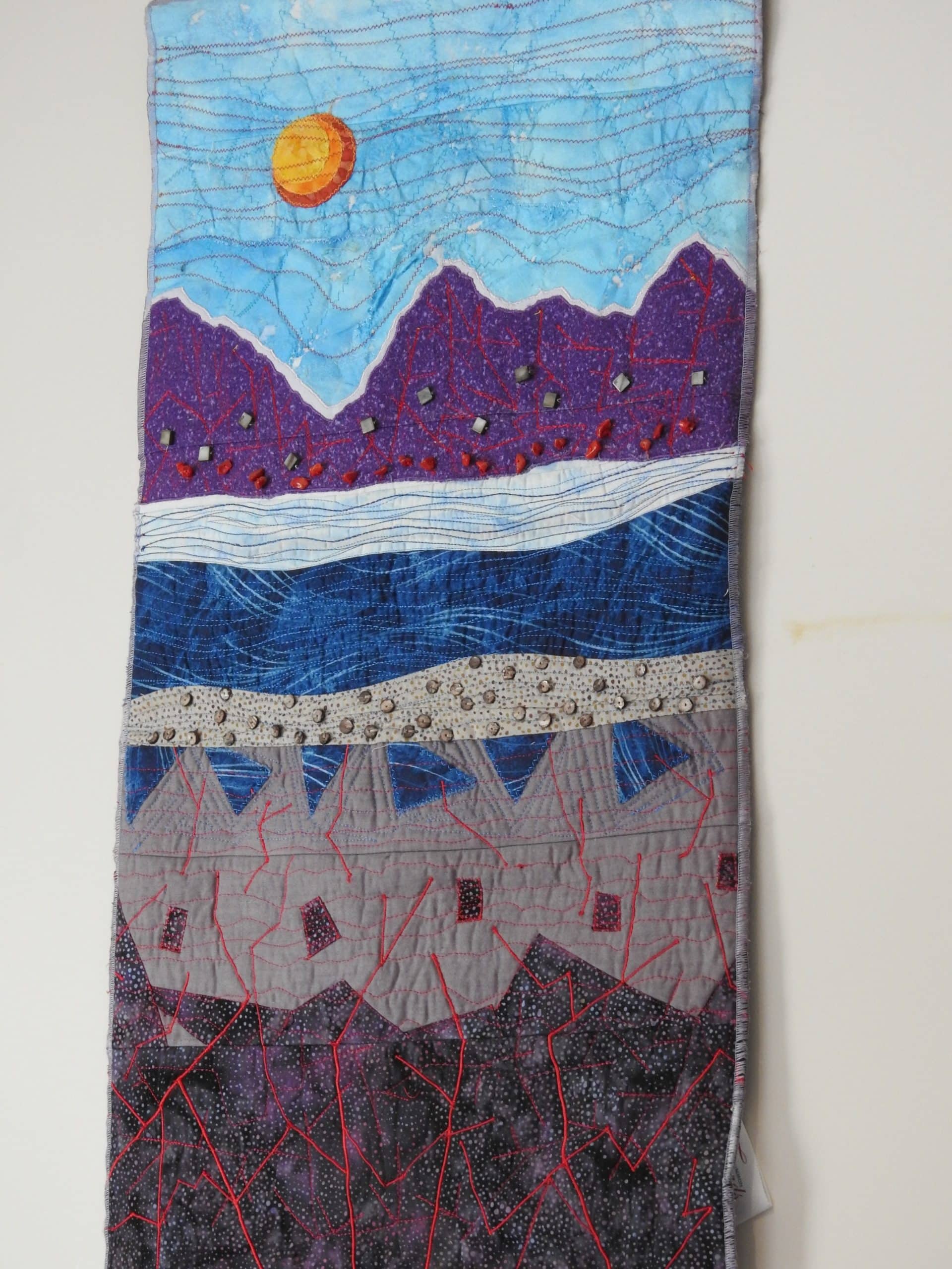 She finds her expression through the tapestries she creates on cloth, making dyes out of natural products and transposing her ideas into tactile wall hangings, table runners, art cards and so much more.
