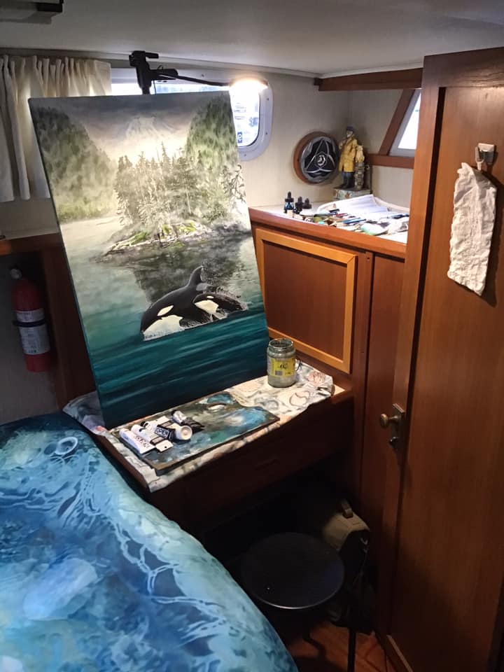 She lives aboard on her Uniflite power boat with her husband Ron, and the ocean is both home and muse.