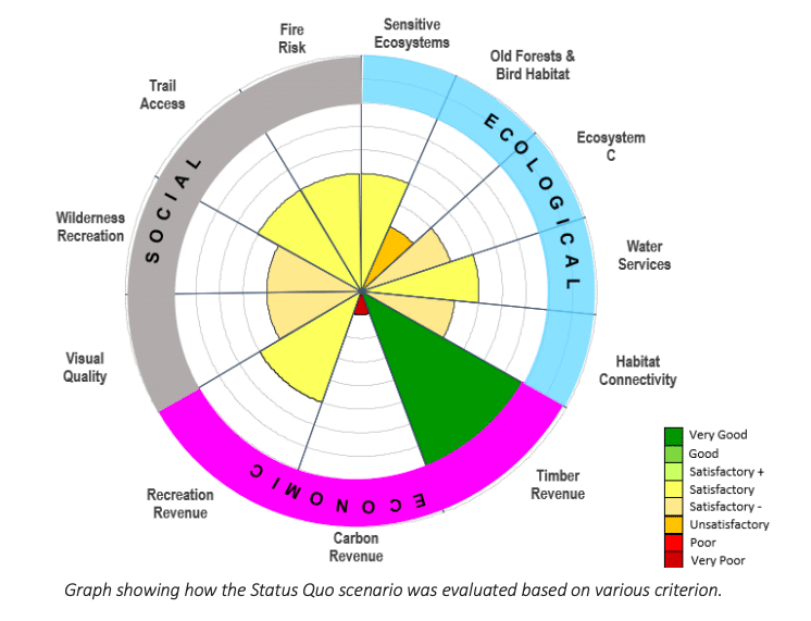 The consultants gave this scenario an “unsatisfactory” score for preserving the endangered mature-forest habitat that birds and other local species depend on. The scenario also scored on the low end of “satisfactory” for habitat connectivity, carbon storage, wilderness recreation opportunities and visual quality.