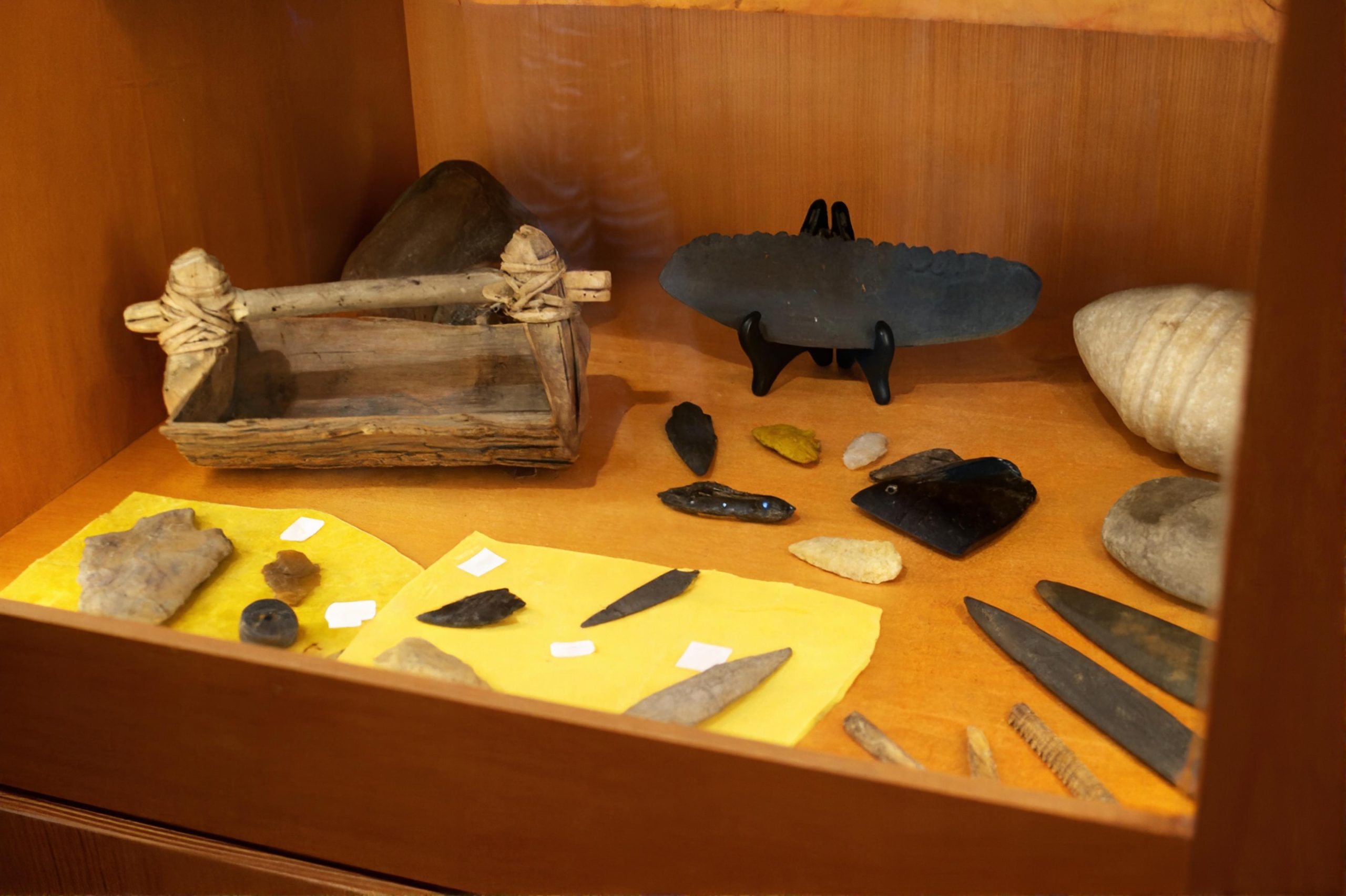 The collection at the museum also includes items such as wooden fish hooks, stone and obsidian tools and a woven cattail mat used for insulation. The obsidian, which originated on the Oregon coast, showcases the extensive trade networks formed by First Nations people, according to Crocker.