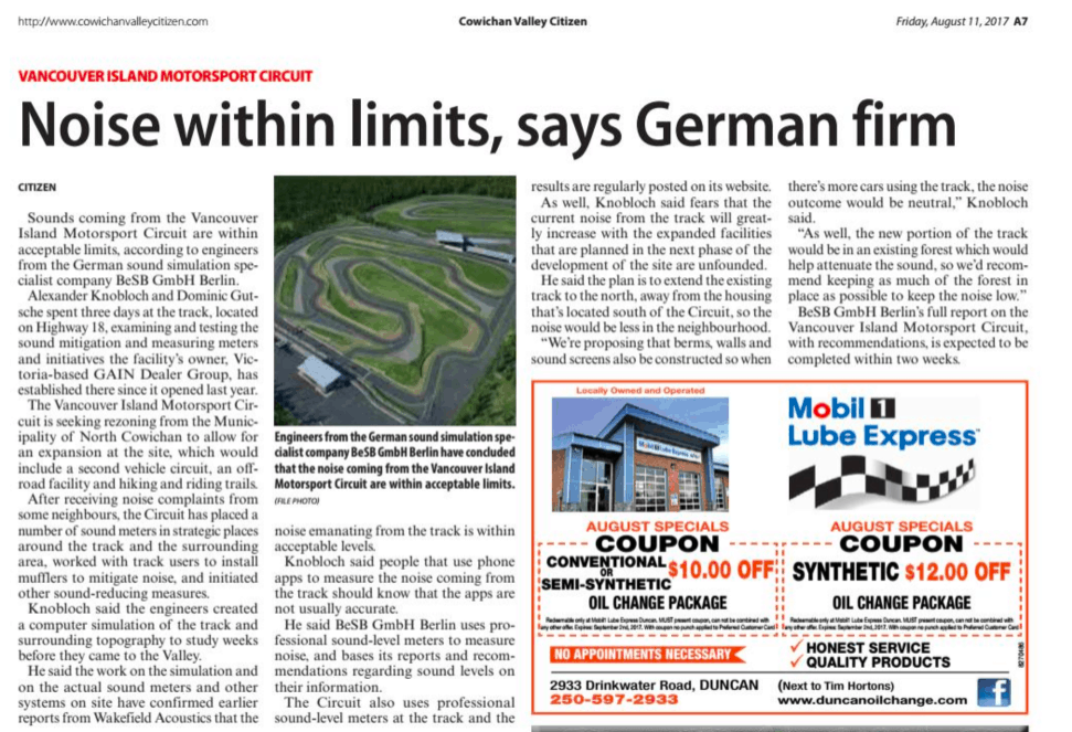 The Citizen publishes an article stating that German sound engineers assessed noise at the Vancouver Island Motorsport Circuit and found it to be within acceptable limits. It does not mention that the noise study was commissioned and paid for by VIMC. The Citizen did not reach out to the Sahtlam Neighbourhood Association for comment. The article is credited to the Citizen, rather than an individual reporter, an unusual practice for articles published in the news section.