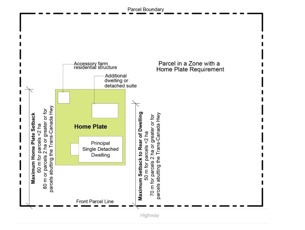 The current bylaws do not require an owner to build their home in a specific spot on the property. In the new proposed bylaw, if a property is in an Agricultural Zone (A-1 or A-2) and is less than two hectares, property owners must cluster the principal dwelling, suites and accessory buildings within either 60 metres of the front or side parcel line, which it calls a “home plate.” For larger properties over two hectares, the maximum distance is 80 metres.