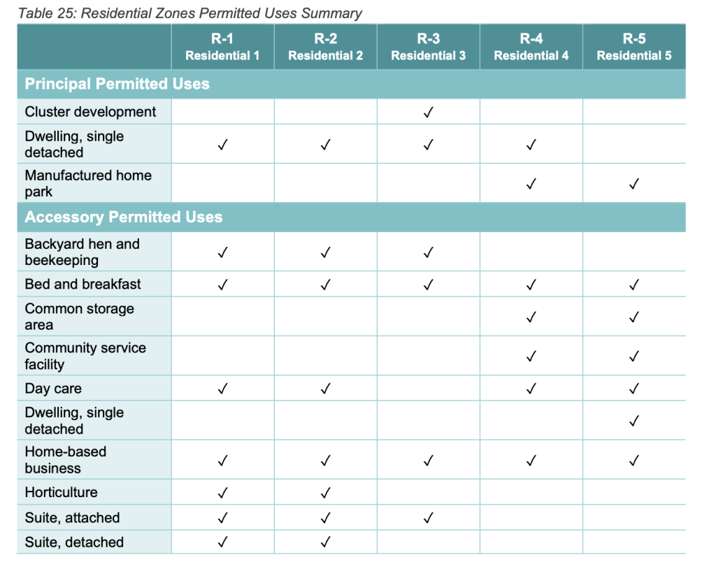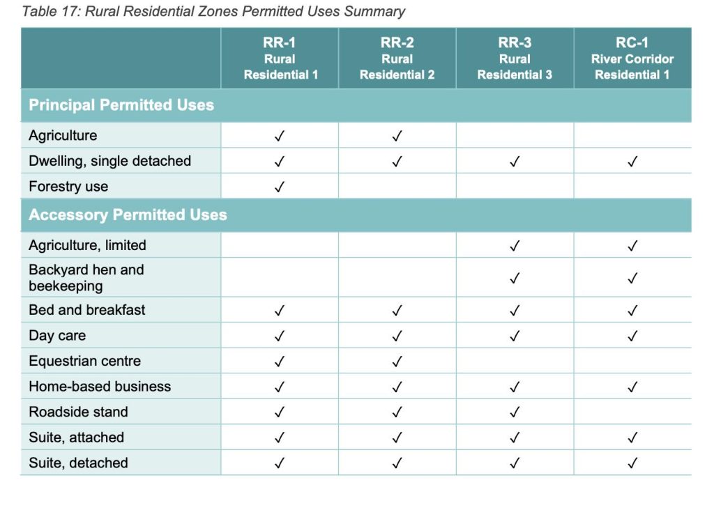 Rural Residential 1 and Rural Residential 2 designated properties would not be permitted to keep hens as an accessory use according to a table in the draft bylaw, although agriculture is an allowed principal use and includes keeping poultry. Meanwhile, the draft bylaw doesn’t allow agriculture as a principal use on properties zoned Rural Residential 3 or River Corridor Residential 1, but does allow backyard hen and beekeeping and limited agriculture as accessory uses.
