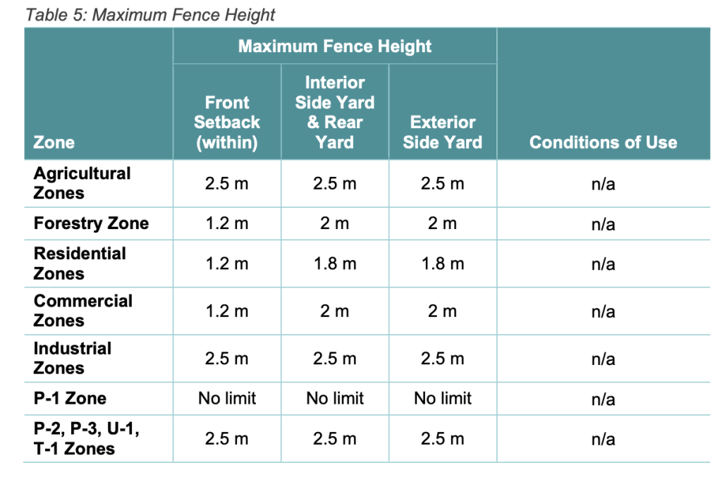 In the new proposed bylaw, residential properties still have a fence height limit of 1.2 metres along the front setbacks while the maximum fence height in agricultural and industrial areas remains 2.5 metres, except for Area H and B which did not have a maximum height for fences on agricultural properties.