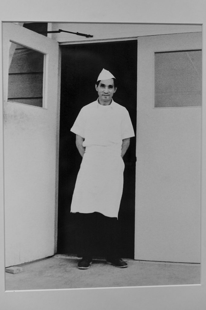Another photo is what the curators call a “selfie” of Kin Jung standing in the doorway with his apron and cook’s hat on. This type of photo of himself, taken by someone unknown, is included alongside his original photos.