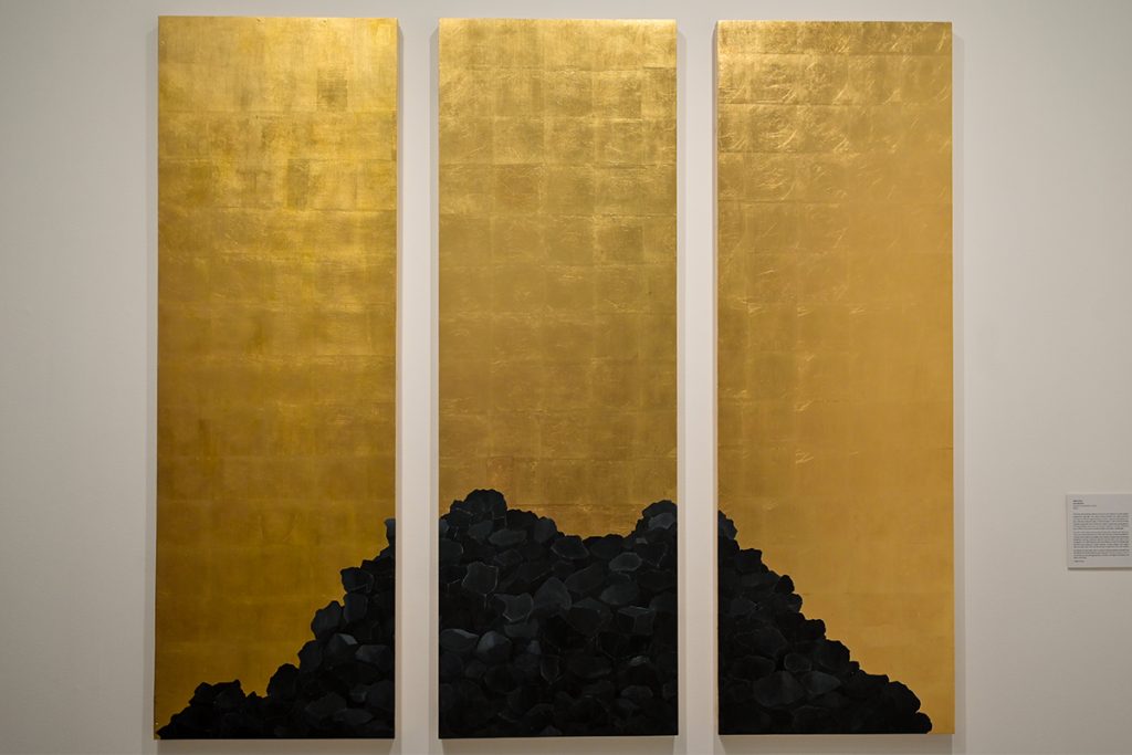 Jackie Wong’s Coal Mountain shows a pile of coal against a gold background, evoking the term “gold mountain” used by Chinese migrants to describe North America as a land of wealth and opportunity.
