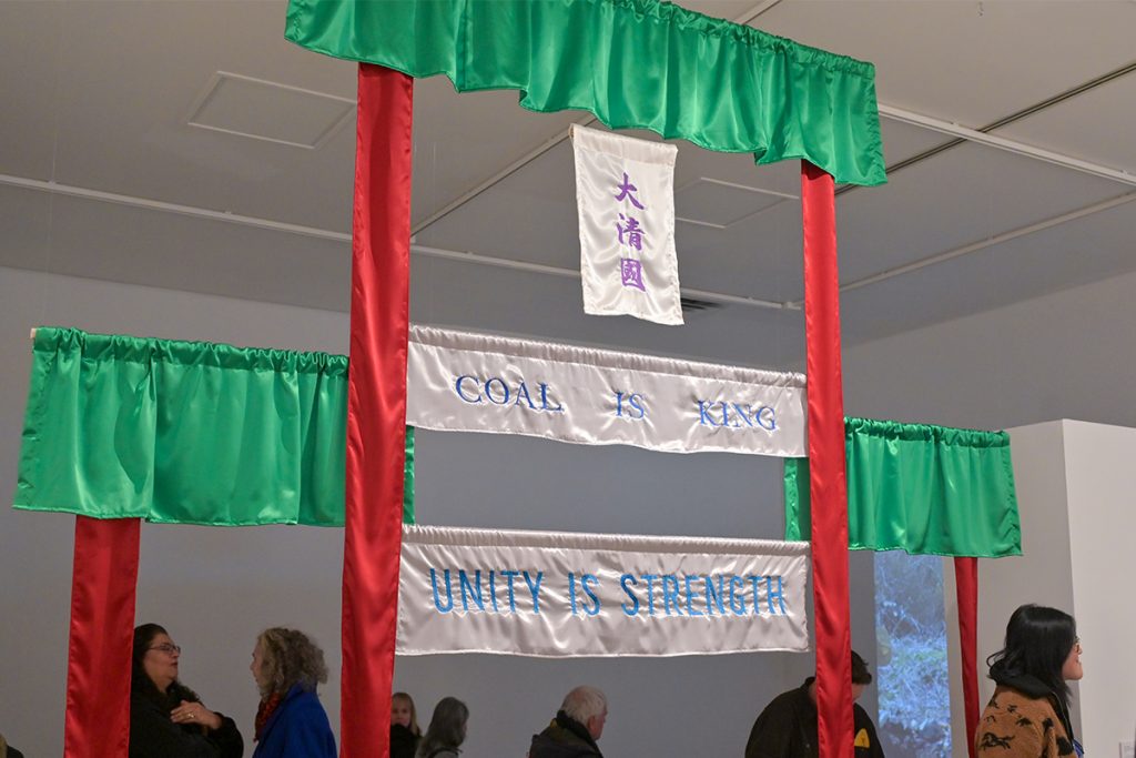 At the gallery, there is a fabric recreation of a Chinese gate with the words “Coal is King” on it. Patrons who walk under it are met with a screening of the film Pine Street, Now and Again by filmmaker Charlotte Zhang.