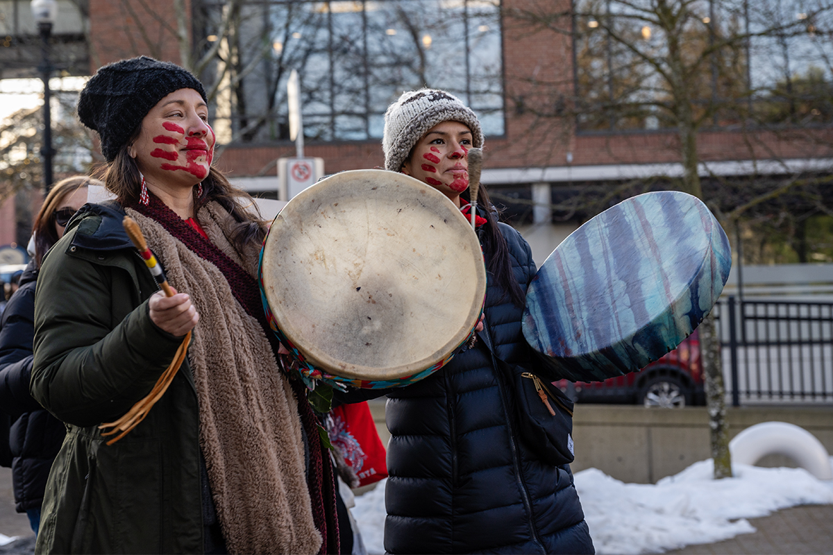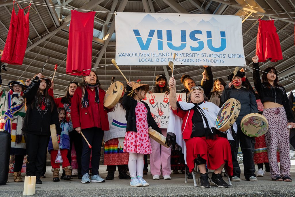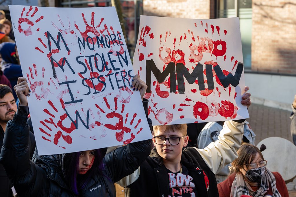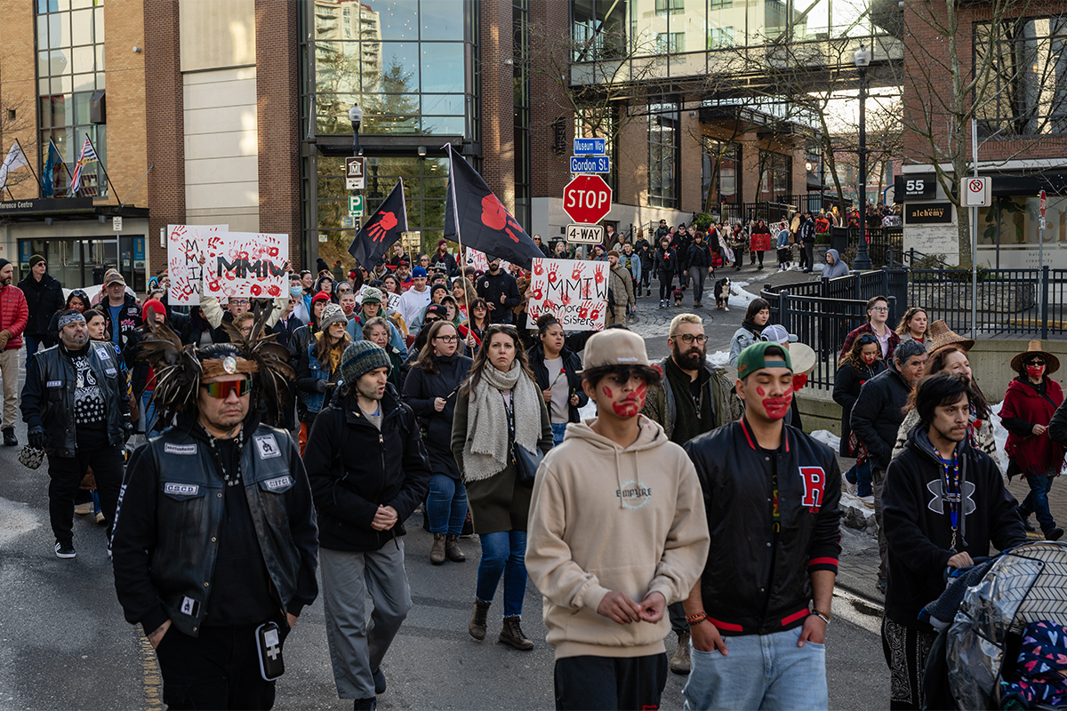 Hundreds of people marched through downtown Nanaimo on Feb. 14 remembering missing and murdered Indigenous women and girls and 2SLGBTQQIA people (MMIWG2S+).