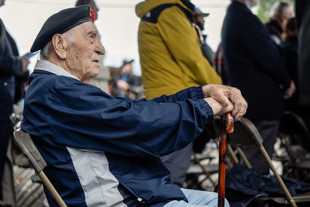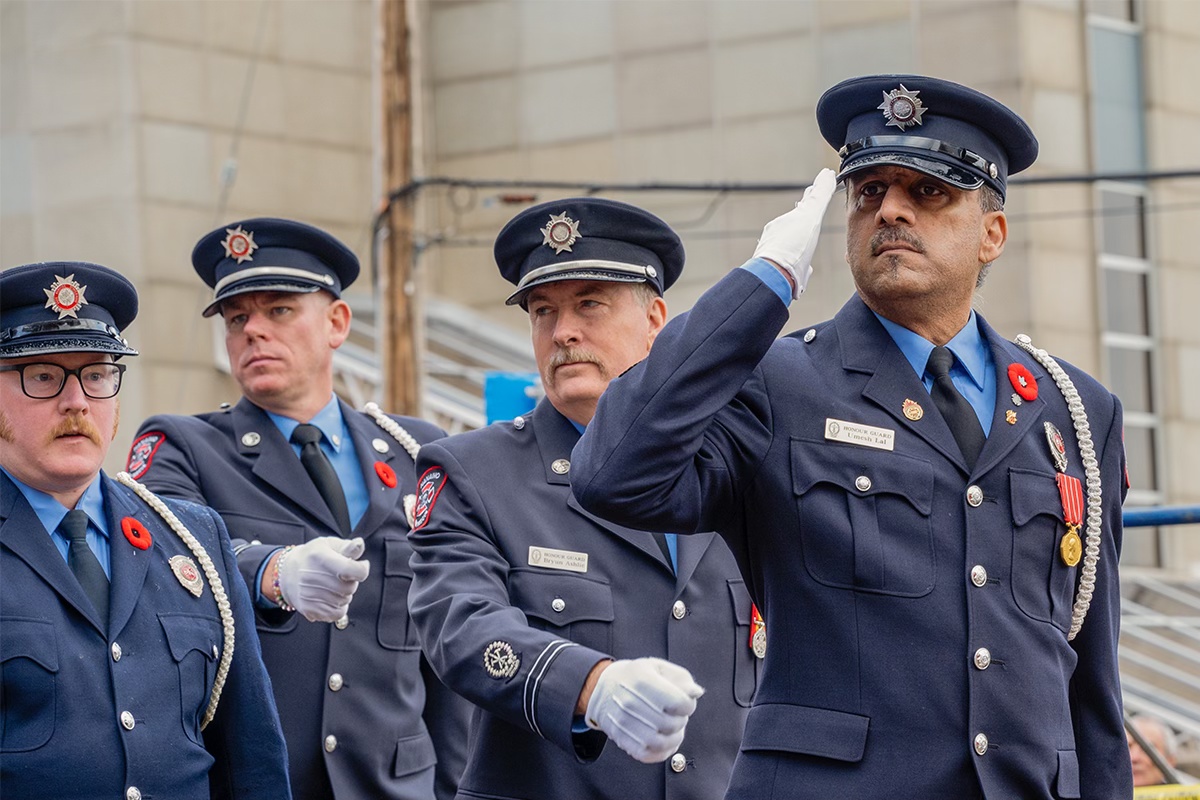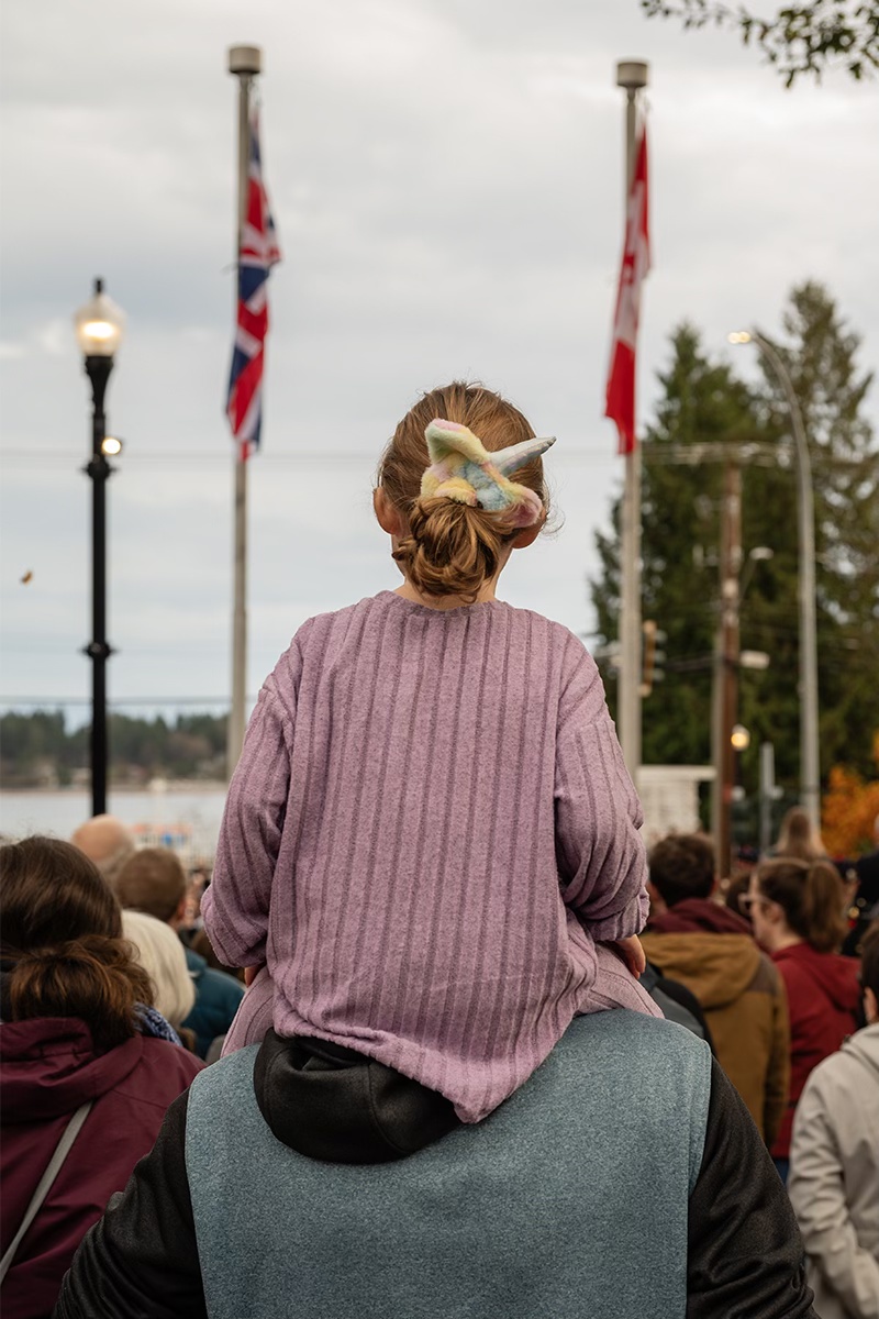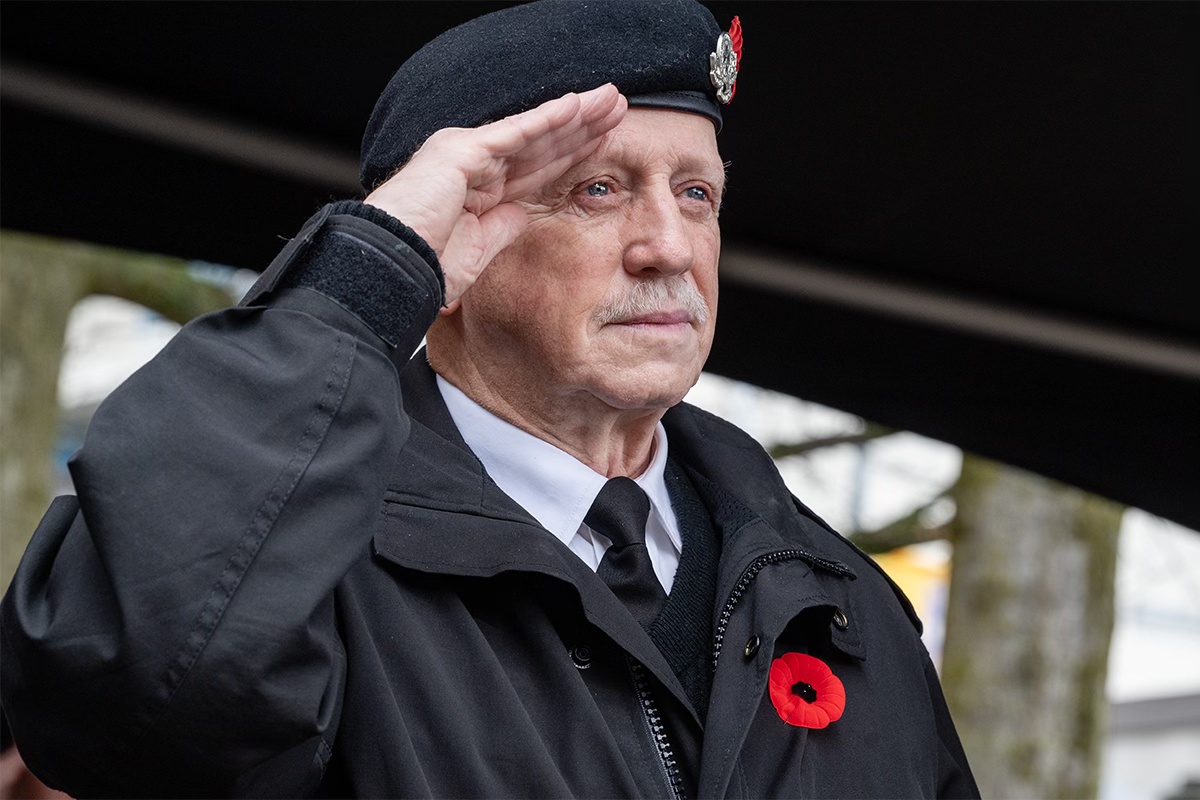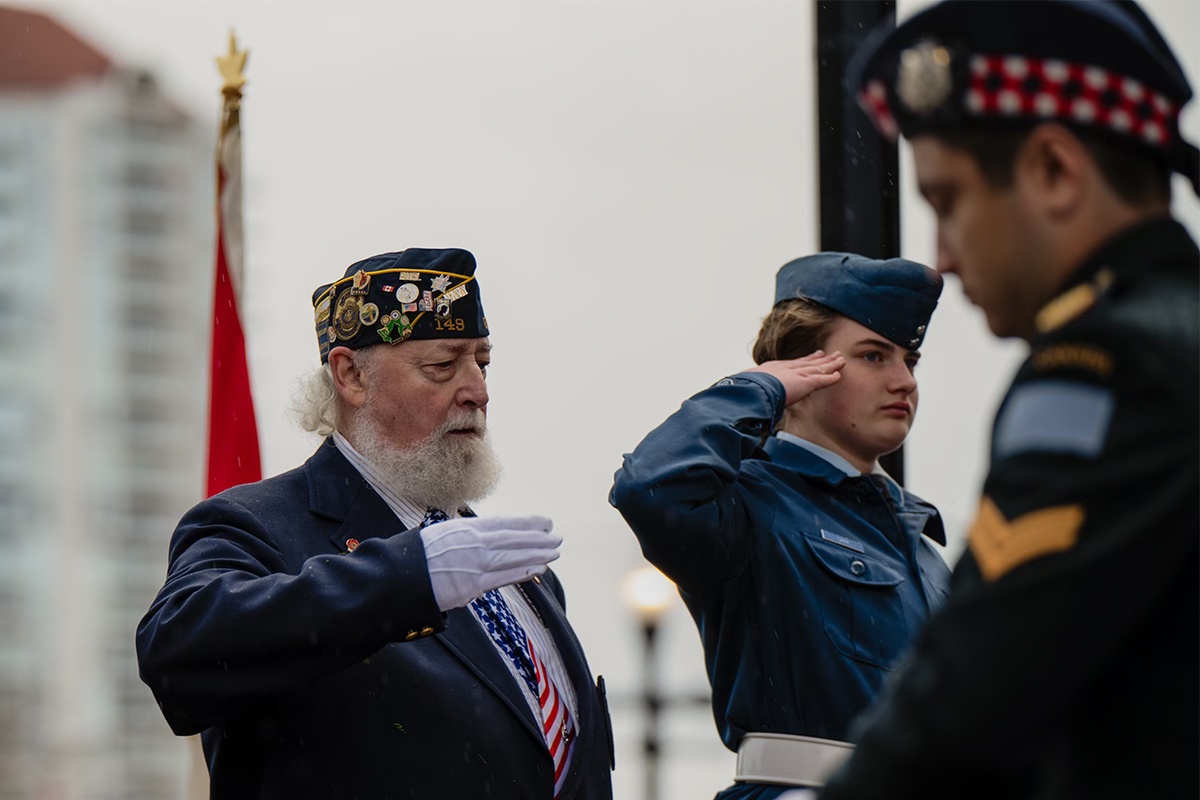 Bob Sears salutes during the Remembrance Day ceremony in Nanaimo on Nov. 11, 2024.A veteran sits watching the Remembrance Day ceremony in Nanaimo on Nov. 11, 2024. An American veteran salutes after laying a wreath at the Remembrance Day ceremony in Nanaimo on Nov. 11, 2024. A Legion member holds the Legion flag during the Remembrance Day ceremony in Nanaimo on Nov. 11, 2024.George Molnar, first vice president of Branch 256, marches with Canadian Legion members during the Remembrance Day parade on Nov. 11, 2024.A decorated Petty Officer, 2nd Class stands at attention during the Remembrance Day ceremony in Nanaimo on Nov. 11, 2024. Sailors from the Canadian Navy march in the Remembrance Day parade in Nanaimo on Nov. 11, 2024.Soldiers from the Canadian Scottish Regiment march during the Remembrance Day parade in Nanaimo on Nov. 11, 2024.Nanaimo firefighters march in the Remembrance Day parade in Nanaimo on Nov. 11, 2024.A Sea Cadet salutes during the Remembrance Day parade in Nanaimo on Nov. 11, 2024. An Air Cadet guards the Cenotaph in downtown Nanaimo before the Remembrance Day ceremony on Nov. 11, 2024,. A young girl sits on her father’s shoulders as she watches the Remembrance Day ceremony in Nanaimo on Nov. 11, 2024.