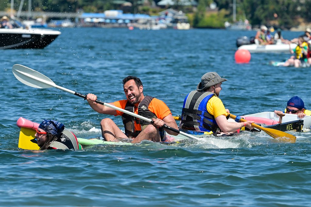 Thousands of spectators at Nanaimo’s 39th annual Silly Boat Regatta were cheering for Lisa Mertin as she paddled alone on her makeshift boat by the Royal Bank of Canada (RBC) team. Mertin was the only crew member who could manage to sit on the boat without immediately slipping and falling into the water.