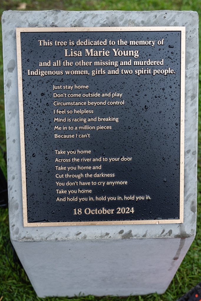 The plaque dedicating the tree to Lisa Marie Young and all other missing and murdered Indigenous women, girls and two-spirit people has lyrics of Lisa’s Song by Allison Crowe and Band. It reads: