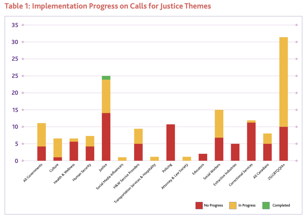 A 2024 progress report from the Assembly of First Nations noted that two of the 231 Calls for Justice had been fully implemented by the federal government at the time.