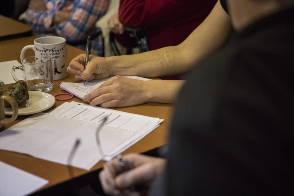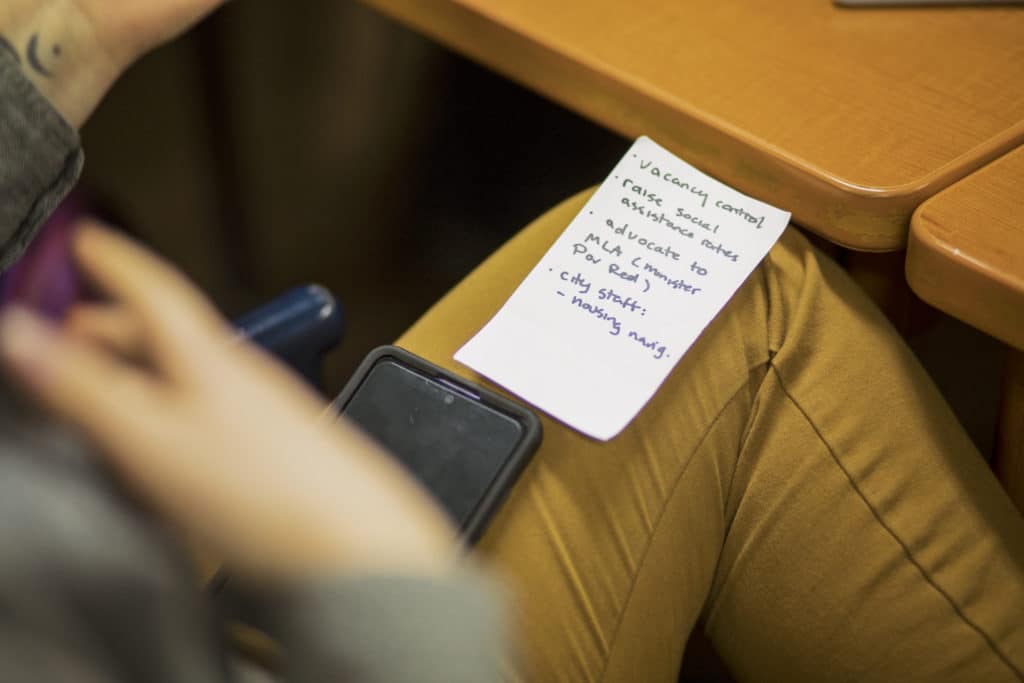 Some attendees car pooled to get there in the pouring rain. A few people attended as observers, including two city councillors, Hilary Eastmure and Erin Hemmens, along with Sacia Burton, a representative from the BC Poverty Reduction Coalition.