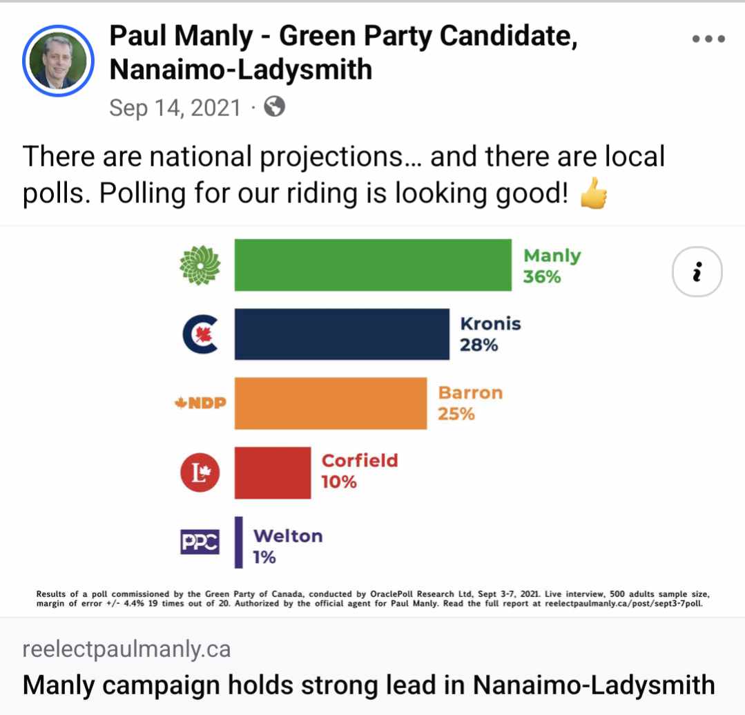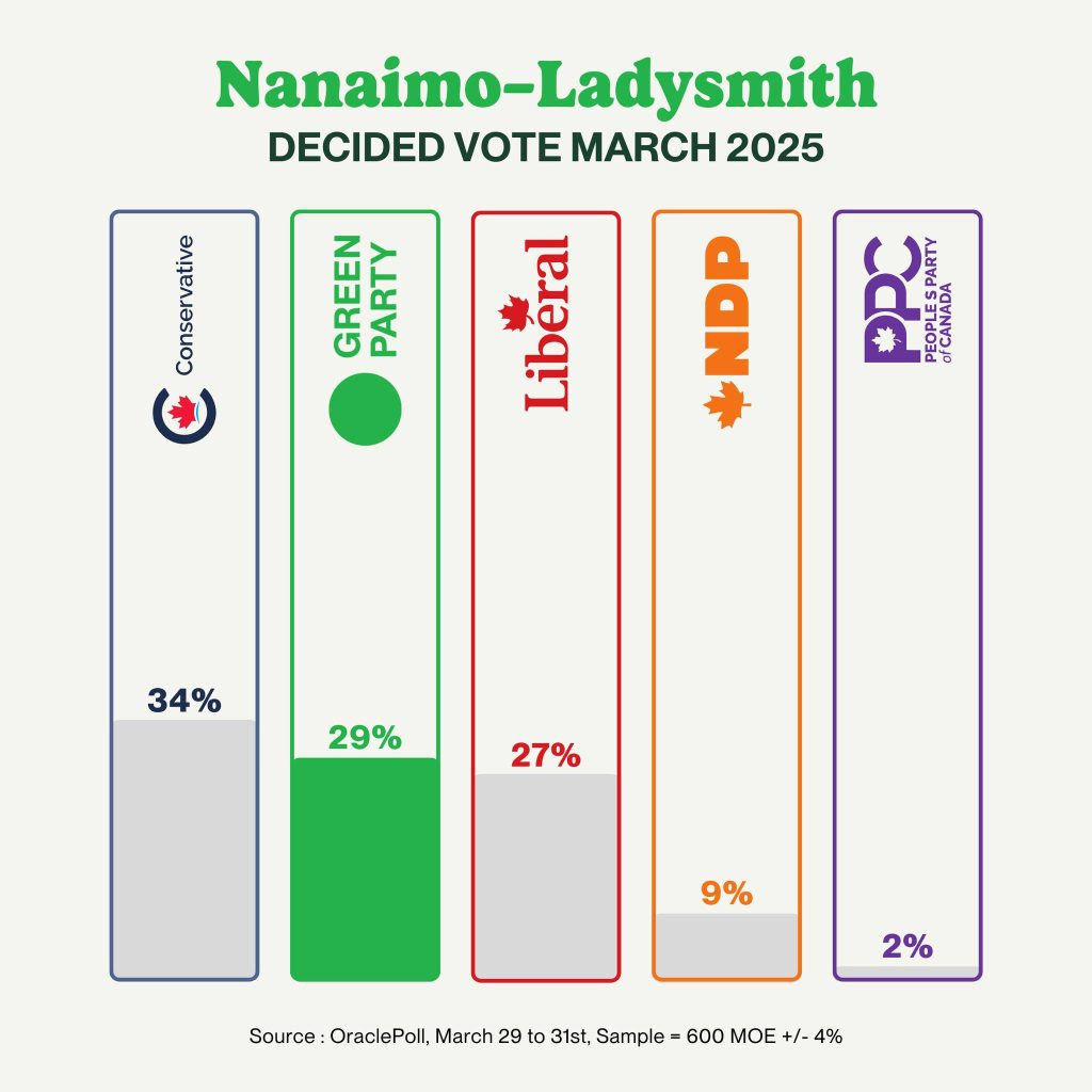 A new poll conducted by Oraclepoll Research for the Green Party between March 29 and 31 shows support for the Liberals in Nanaimo—Ladysmith has surged with the party now in third place with 27 per cent of decided voters saying they would vote Liberal (up 21 percentage points since February).