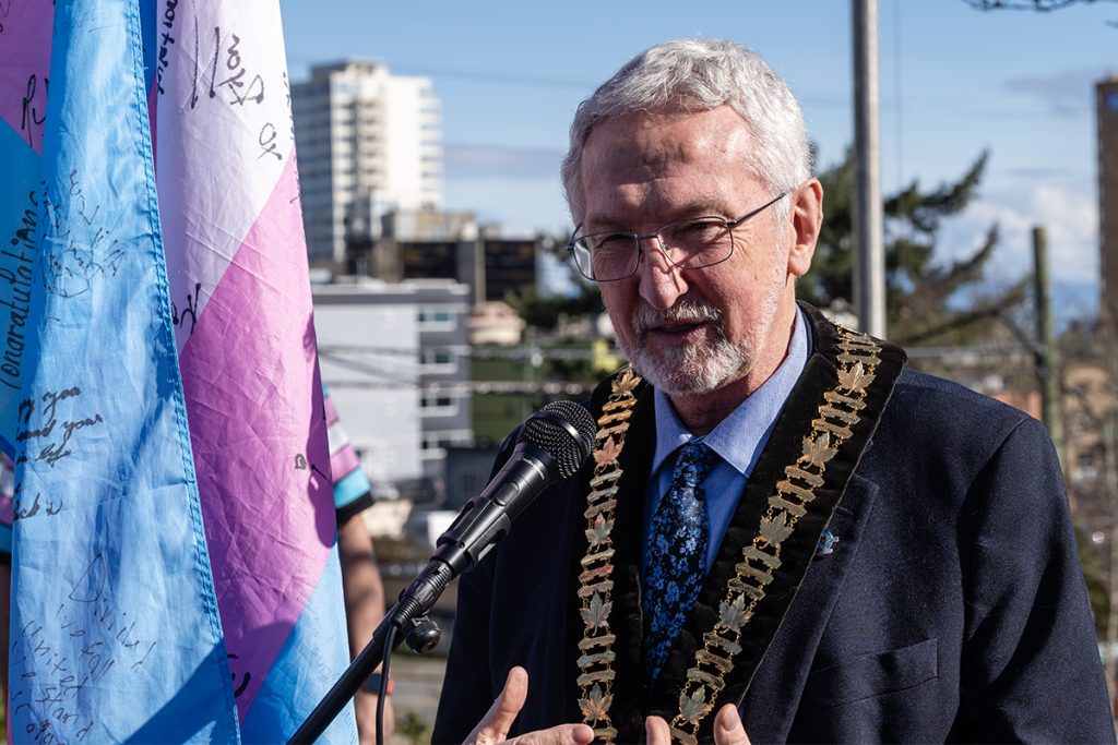 Nanaimo Mayor Leonard Krog, decked out in his official mayoral “bling,” spoke at the flag raising ceremony referencing the rising transphobia in the United States.