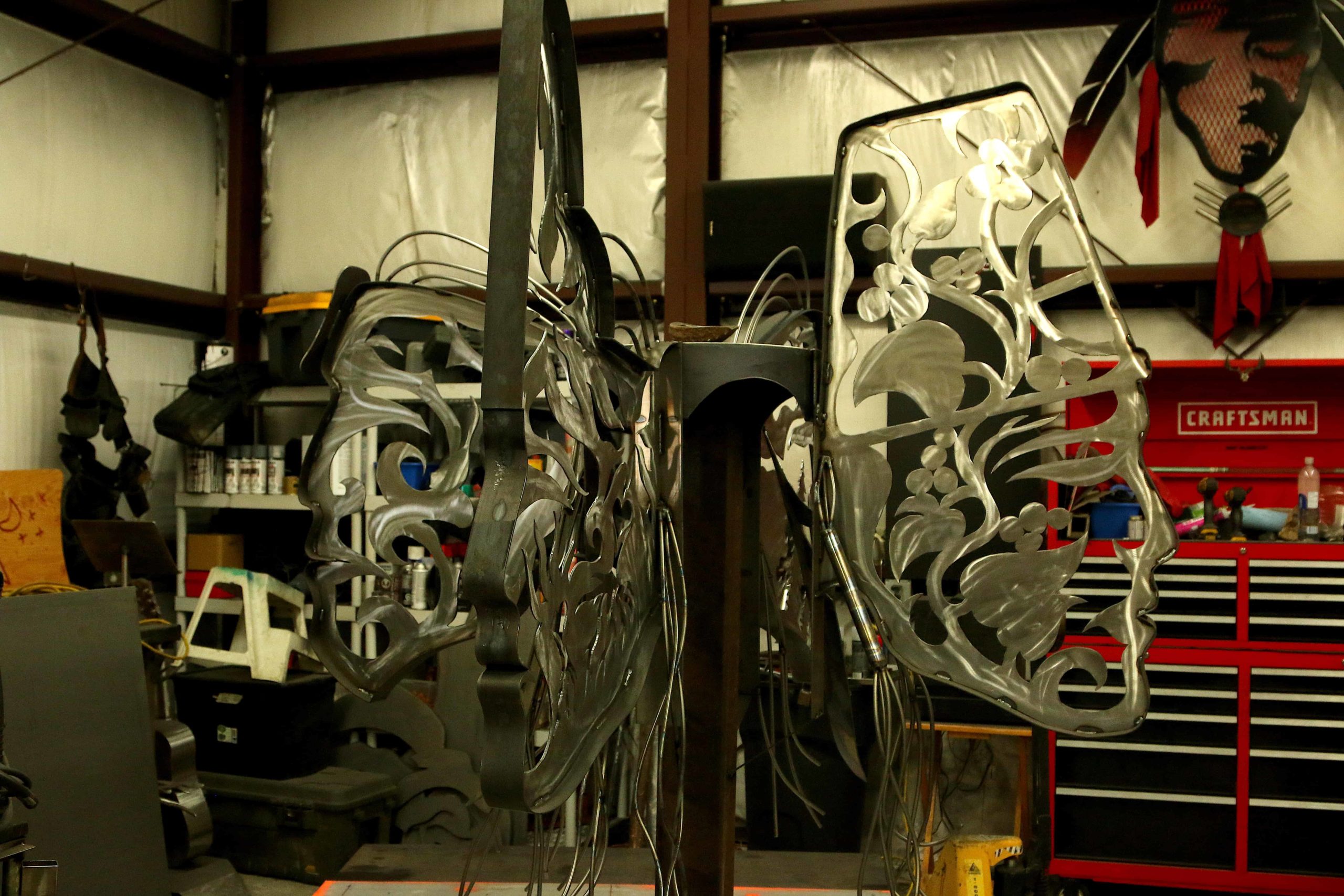 The sculptures are made entirely of steel, both mounted on a hand-carved pole with pictographs engraved along the sides. He is also working on a fourteen-foot standing steel feather.