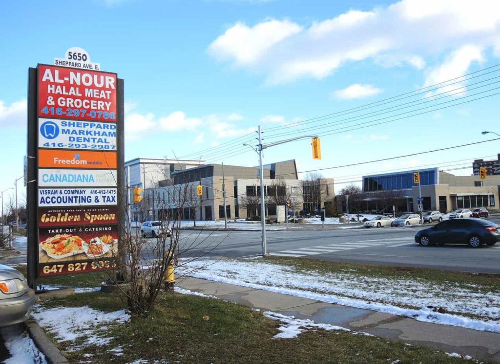 “As discussed, a great little strip plaza in Scarborough. The Stop 20 Plaza was named because it was at the location of the twentieth stop along the radial streetcar line that went from V.P. to Highland Creek way back in the day. It has street credibility with decades of history, many longstanding reputable service businesses, adds to Scarborough’s well-known variety of international cuisine (Sushi and Wok, Il Fresco, Vi Pei restaurants) and has diverse retail, as well as animal care. As you can see by the busy parking lot, it is well attended. There still is an important place for well-tenanted and -maintained strip plazas that serve as community hubs in Scarborough.”