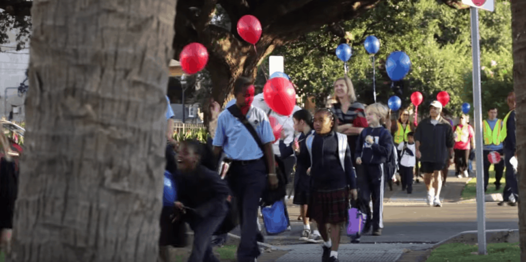 They created meaningful incentives: for every 10 miles that a student walked or biked, the school donated 40 cents to Alpine’s sister school in Kenya for a student lunch program (40 cents is enough to buy a week’s worth of lunches for one student), and the Alpine class with the most miles each month was treated to a lunch similar to what the Kenyan students were eating. The school also designated Walk to School Wednesdays, where students were given extra encouragement to partake. On one occasion the mascot of a nearby university walked with students. That day, 528 of the 555 students who lived within walking distance walked to school, plus many students who regularly took the bus. Only nine cars arrived at the school that morning.