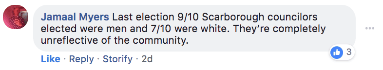 In our Facebook group, member Jamaal Myers posted this thought about how Scarborough city councillors don’t reflect the demographic makeup of the community: