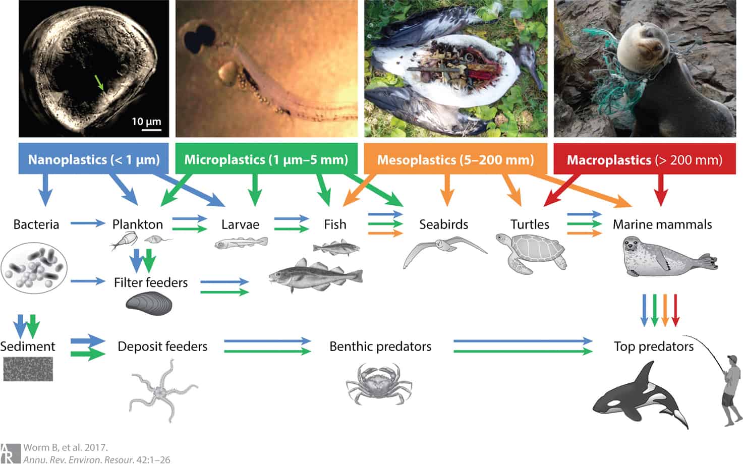 Microplastics enter the food web when animals accidentally ingest or eat them. At the bottom of the food chain, zooplankton, which are microscopic organisms eaten by all kinds of fish, ingest small pieces of plastic that can wind up in the bodies of the animals who eat them. When animals eat other animals that have already ingested plastic, they consume that plastic too.