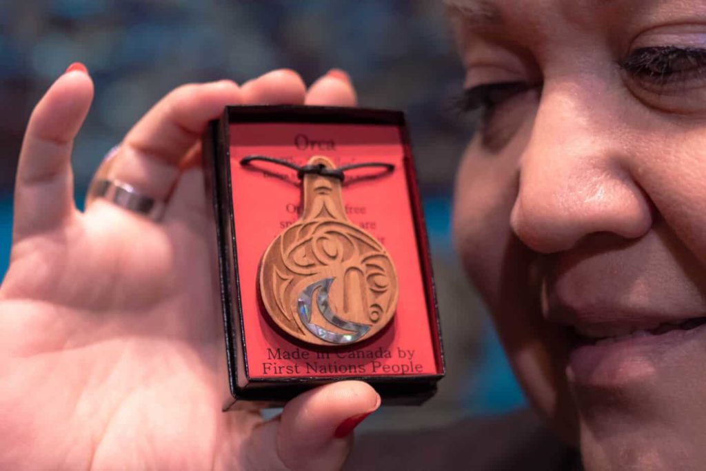 Squamish Nation member Julie Peters has worked for Spirit Works Limited for more than a decade. She intricately inlays abalone into the pieces she helps make. “Everything I do here, I’ve learned from Shain,” she says.