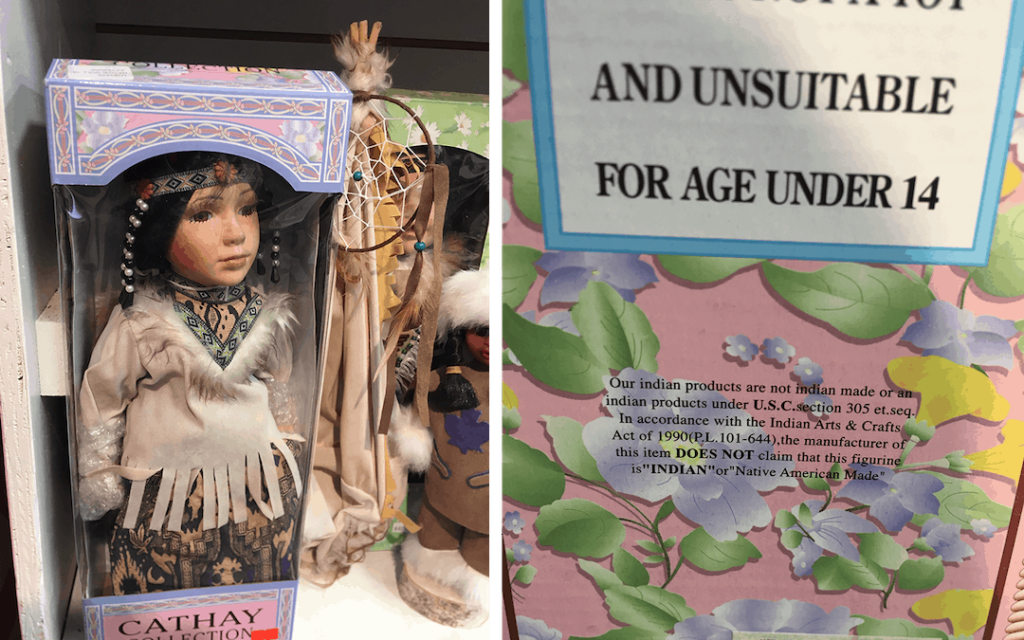 The manufacturer Cathay Collection produces a line of dolls, for example, that supposedly depicts an Indigenous figurine and includes a note for customers on the box: “Our Indian products are not Indian-made or an Indian product … In accordance with the Indian Arts & Crafts Act of 1990… the manufacturer of this item DOES NOT claim that this figurine is ‘INDIAN’ or ‘Native American Made.’”