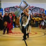 After Swanson’s introduction, the floor was blessed by an elder. A series of opening dances was performed, ending with a peace song. Swanson told the gathering that the potlatch was not about shame. It was about rebuilding unity within the nation in the face of powerful forces coming from outside the Haida world, as well as re-establishing cultural protocol following the multigenerational impacts of residential schools and the potlatch ban.
