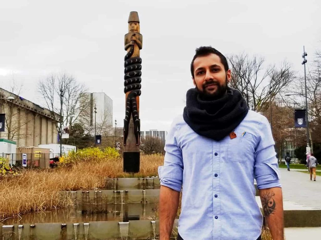 Chris Rambaran stands on traditional, unceded Musqueam territory in front of the Musqueam post at the University of British Columbia, where he works as an Enrolment Service Advisor for former youth in care.