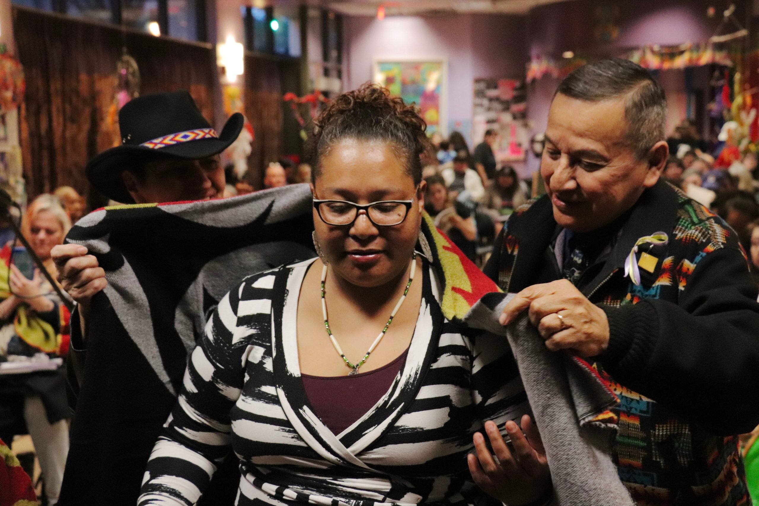 During the opening of the ceremony, Musqueam First Nation member Cecilia Point spoke about the cultural significance of blanketing for her community — how traditionally they’d spend months making blankets out of wild dog fur, and how today it remains a great honour to be blanketed.