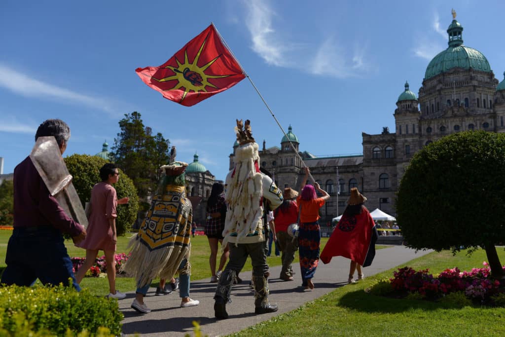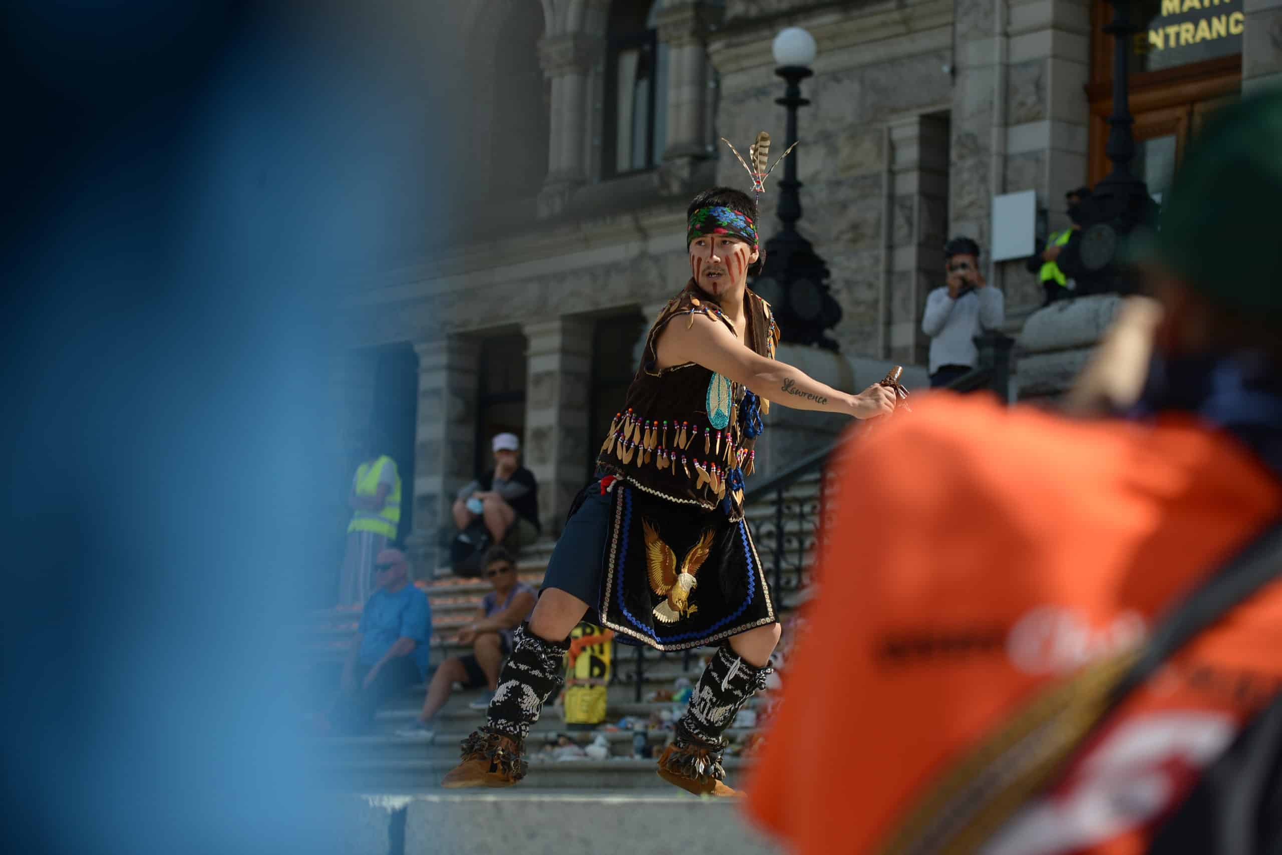 After the demonstrators walked through downtown, they arrived at the B.C. legislature buildings where a crowd of supporters and witnesses were waiting. Cultural and hereditary chiefs spoke, and many traditional songs were sung, while dancers danced at the steps of the building.