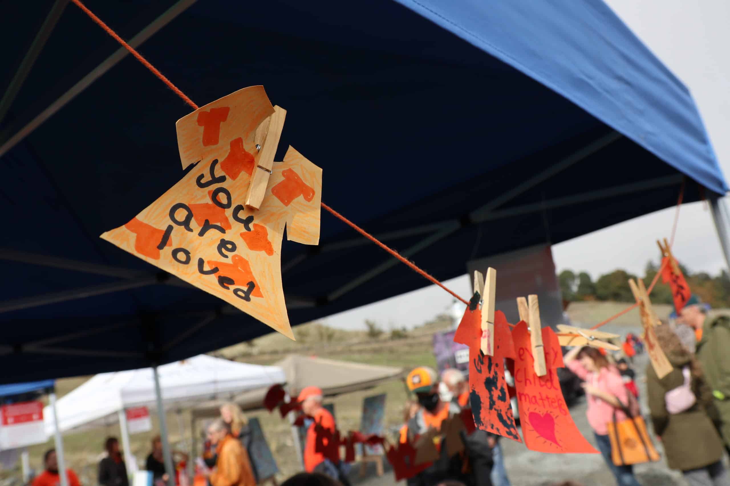 In addition to gathering at the beach and listening to stories from Elders and residential “school” survivors, members of the public contributed to a public art project, which includes handprints from children and their parents.