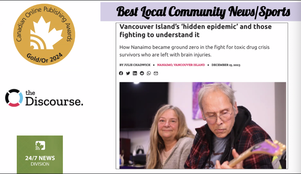 The Discourse Nanaimo took GOLD 🥇 in the Best Community News category for Julie Chadwick’s Vancouver Island’s ‘hidden epidemic’ and those fighting to understand it. The in-depth story explores how a group of Nanaimo-based researchers and community advocates have been building awareness about the link between the toxic drug crisis and brain injuries while fighting to make sure people with brain injuries get the support they deserve.