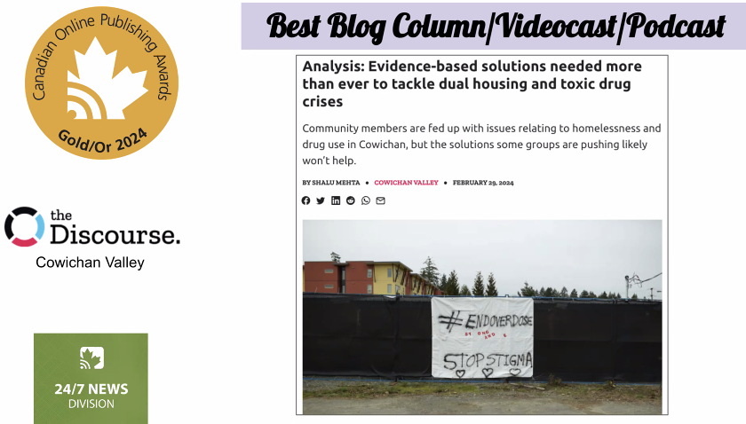 The Discourse Cowichan’s Shalu Mehta took GOLD 🥇 in the Best Column category for Evidence-based solutions needed more than ever to tackle dual housing and toxic drug crises. In this analysis, Mehta explores the roots of the dual housing and drug crises. She examines why experts say both must be addressed in tandem and why imprisonment and forced treatment will not work.