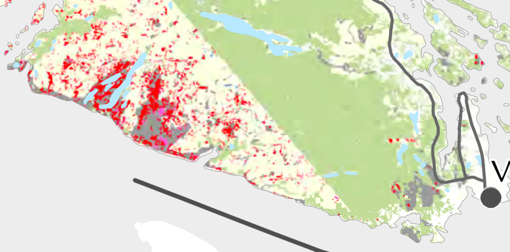 The large swath of green that sweeps down the east side of the Island indicates private land, which was not part of this process. Private forest lands are managed separately from provincial Crown lands, and according to many observers, with little oversight or regard for the preservation of ecological integrity.